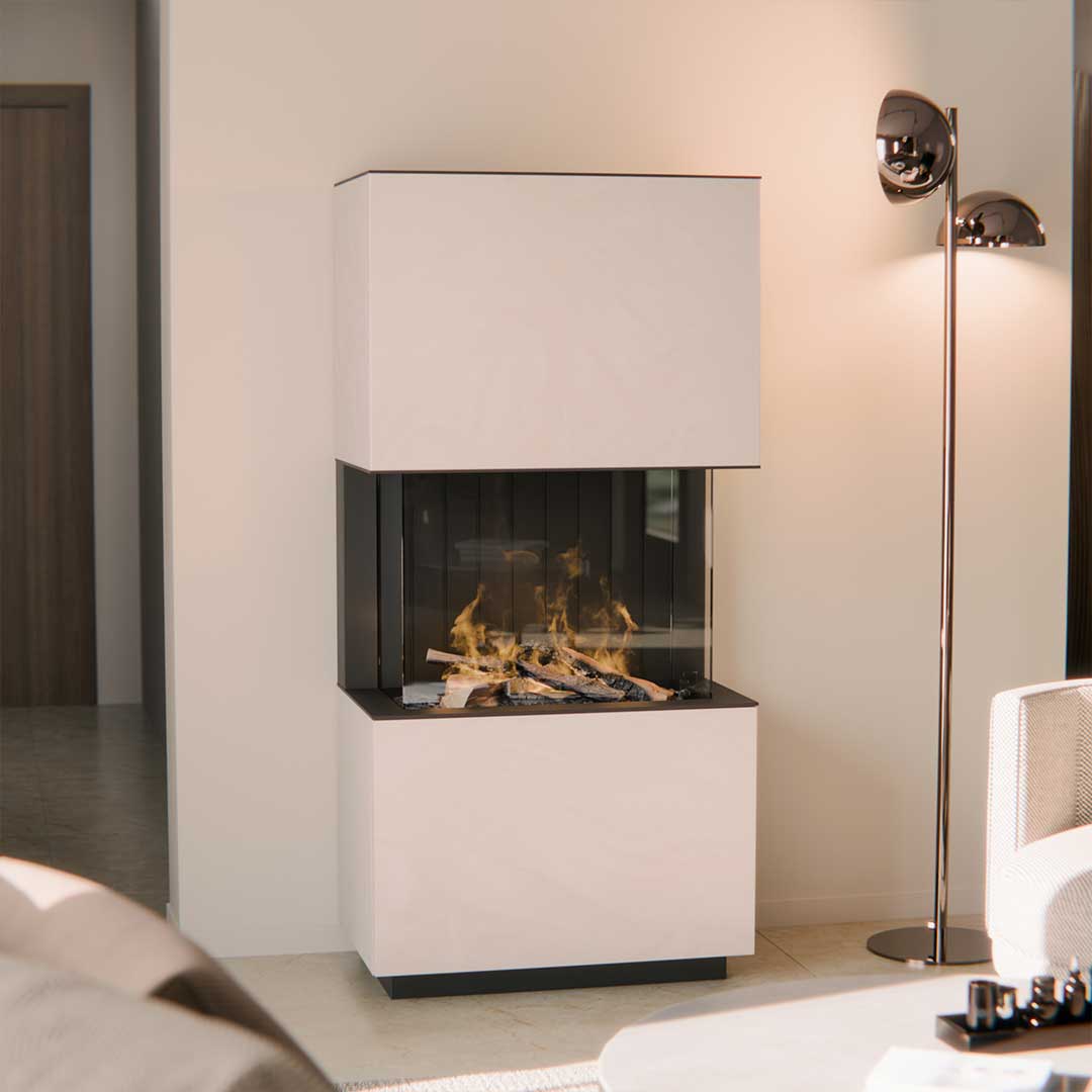 Die Optimyst®-Technologie, die hinter dem Flammenspiel steckt, basiert auf einem Wassertank. Dieser kann einfach entnommen werden und mit Wasser befüllt werden. Für den Flammeneffekt wird das Wasser per Ultraschall fein vernebelt und durch einen warmen Luftstrom nach oben geleitet. Sparsame LEDs strahlen den Wasserdampf dabei von unten an. Das Ergebnis ist ein täuschend echtes und dennoch völlig harmloses Flammenbild. Noch realistischer wird der Effekt in Kombination mit täuschend echten Holzscheiten aus Keramik, die die Flamme zusätzlich verwirbeln.