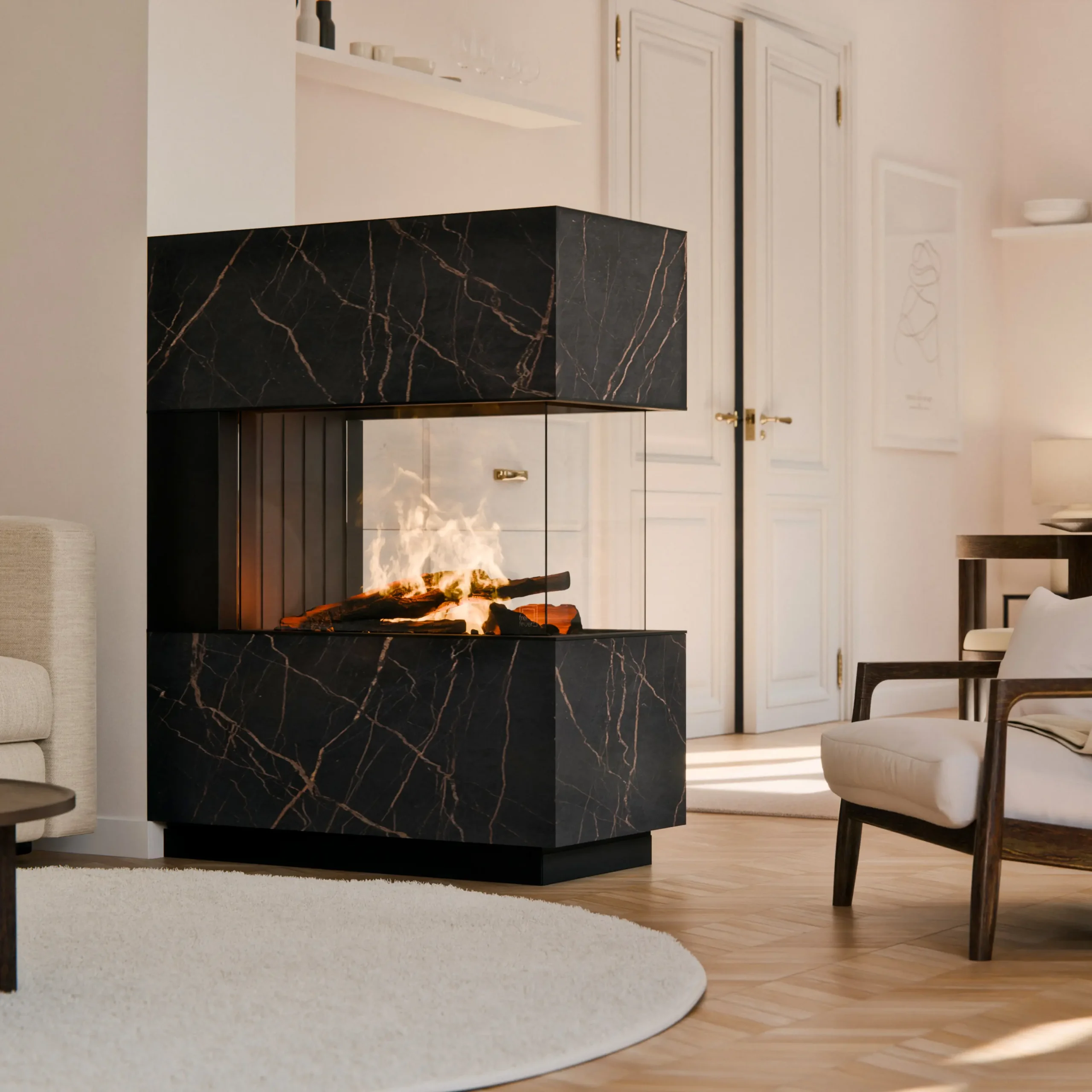 Der Ophyr Maxi Ceramic überzeugt durch edle Keramikoberflächen. Der Ophyr Maxi in der Funktion eines Raumteilers ermöglicht, das Feuer aus mehreren Räumen zu betrachten. Im Vergleich zu dem Ophyr Ceramic, ragt der Maxi tiefer in den Raum rein und bietet somit eine bessere Sicht auf das Effektfeuer.