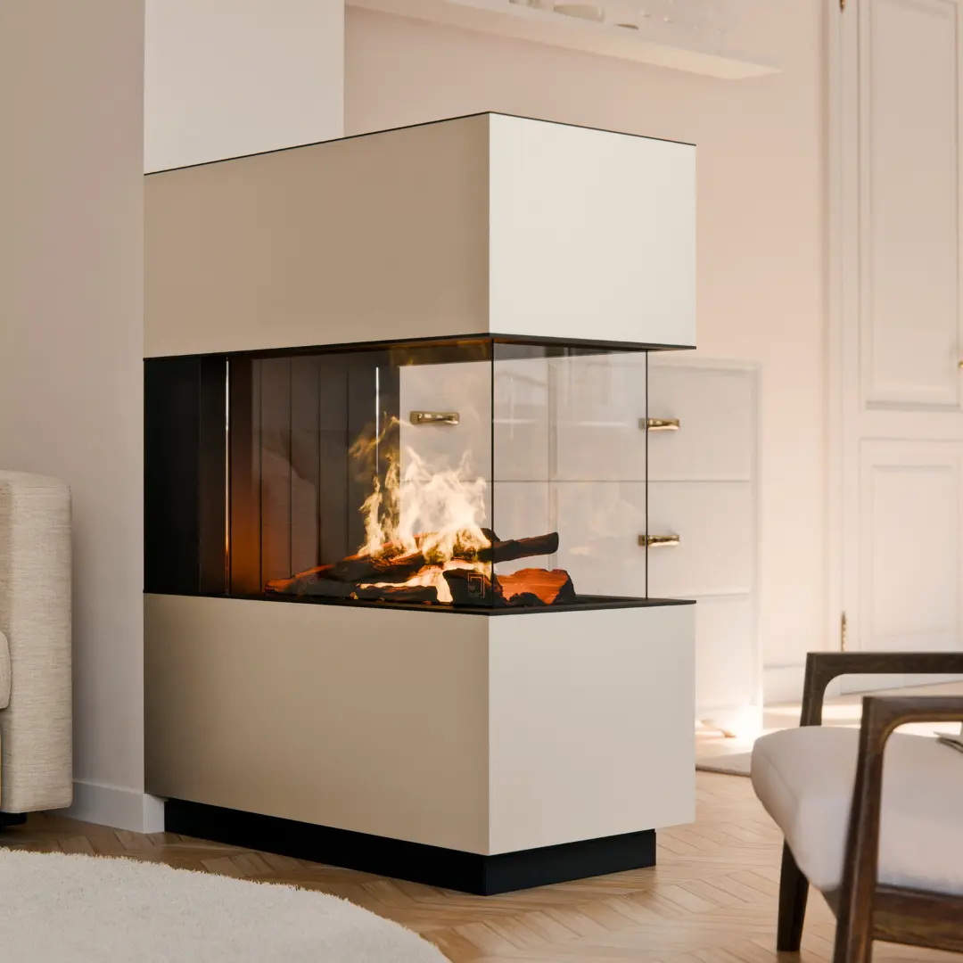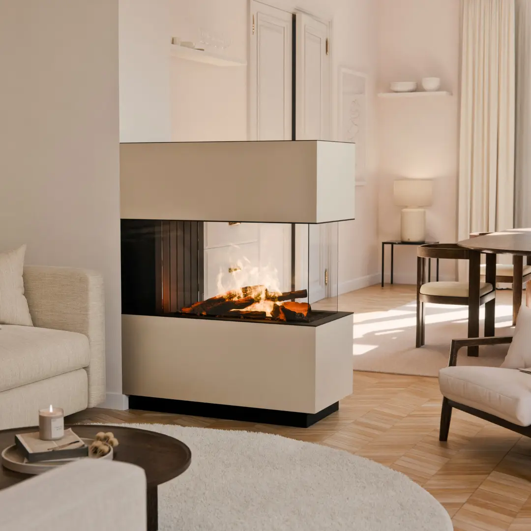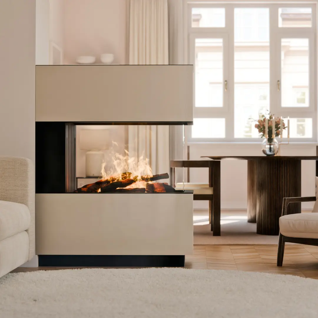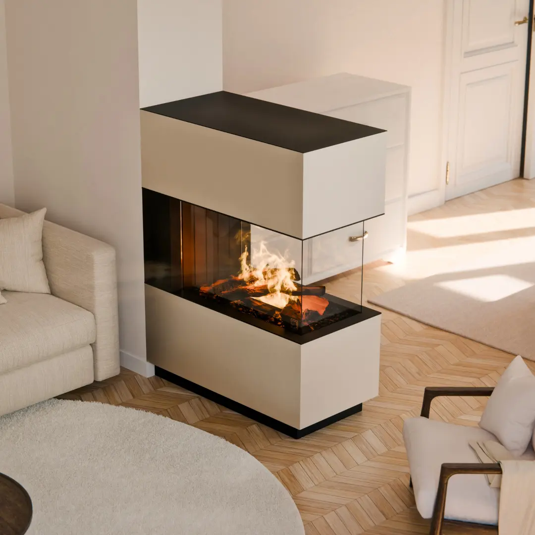 Der Ophyr Maxi Ceramic überzeugt durch edle Keramikoberflächen. Der Ophyr Maxi in der Funktion eines Raumteilers ermöglicht, das Feuer aus mehreren Räumen zu betrachten. Im Vergleich zu dem Ophyr Ceramic, ragt der Maxi tiefer in den Raum rein und bietet somit eine bessere Sicht auf das Effektfeuer.