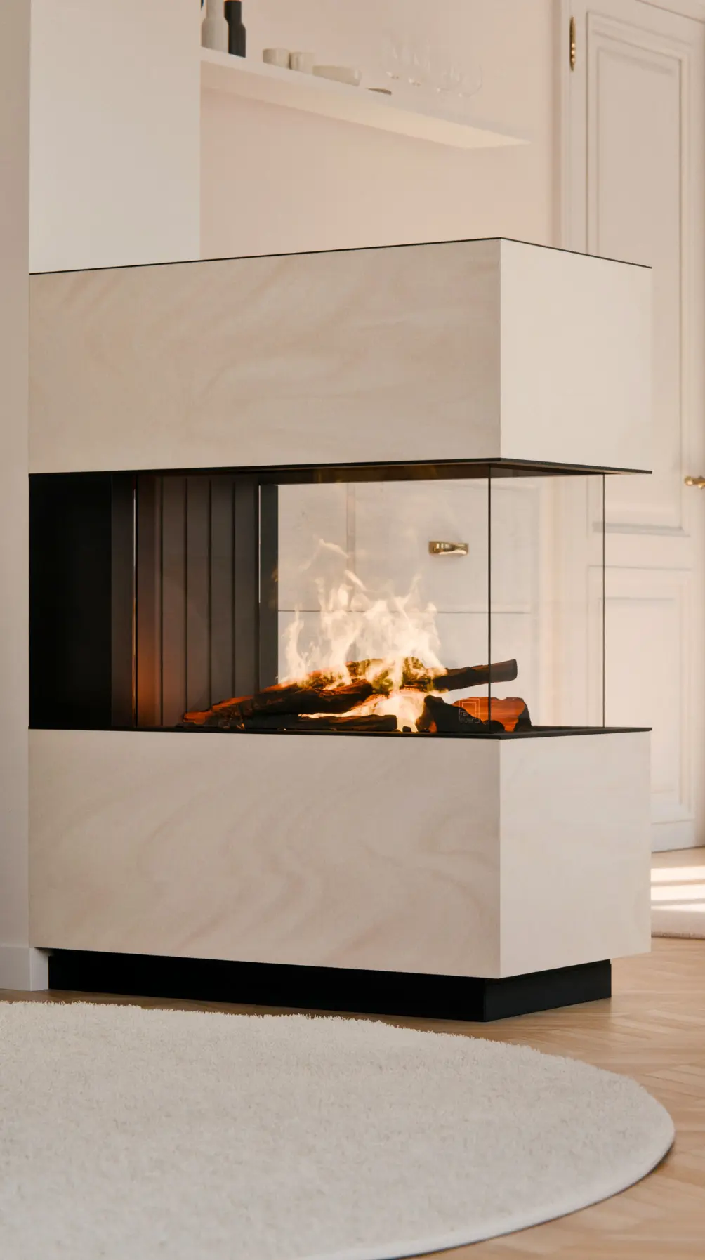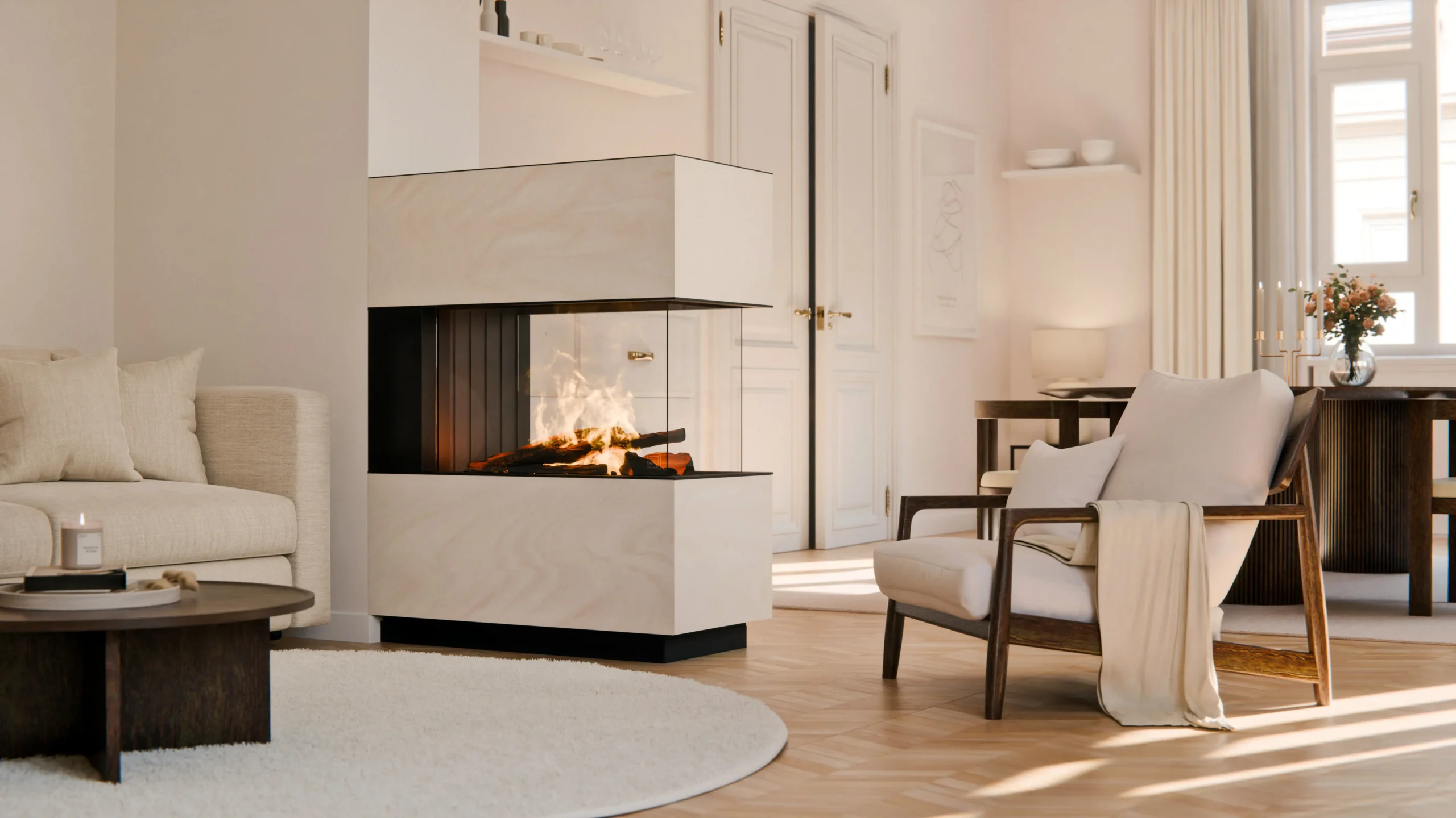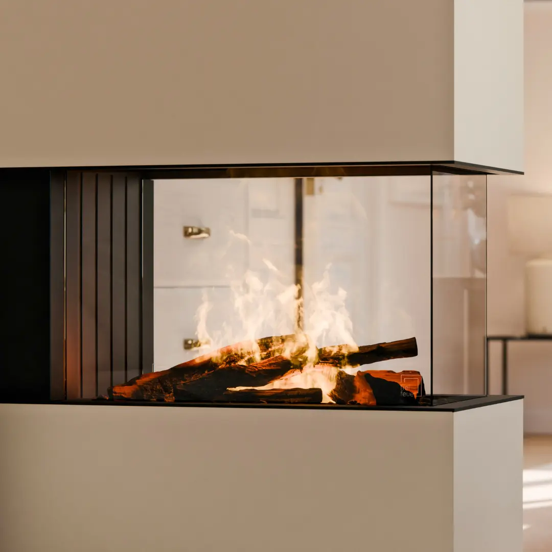 Der Ophyr Maxi Ceramic überzeugt durch edle Keramikoberflächen. Der Ophyr Maxi in der Funktion eines Raumteilers ermöglicht, das Feuer aus mehreren Räumen zu betrachten. Im Vergleich zu dem Ophyr Ceramic, ragt der Maxi tiefer in den Raum rein und bietet somit eine bessere Sicht auf das Effektfeuer.