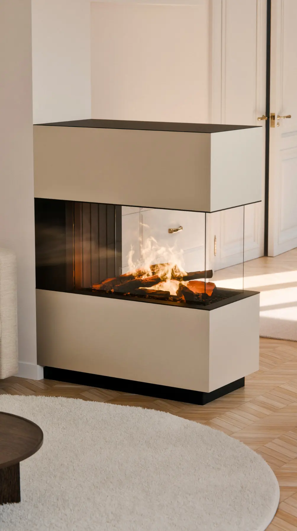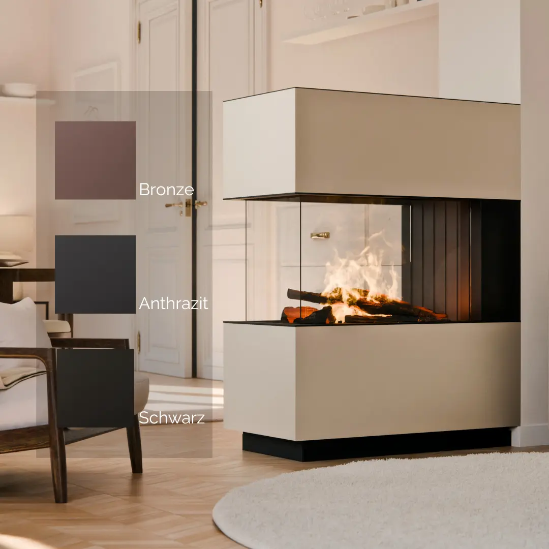 Mit einer robusten Stahlkonstruktion und langlebiger Pulverbeschichtung setzt der Ophyr Maxi Steel moderne Akzente. Die feinstrukturierte Oberfläche sorgt für ein edles Erscheinungsbild. Der Ophyr Maxi in der Funktion eines Raumteilers ermöglicht, das Feuer aus mehreren Räumen zu betrachten. Im Vergleich zu dem Ophyr Steel, ragt der Maxi tiefer in den Raum rein und bietet somit eine bessere Sicht auf das Effektfeuer.
